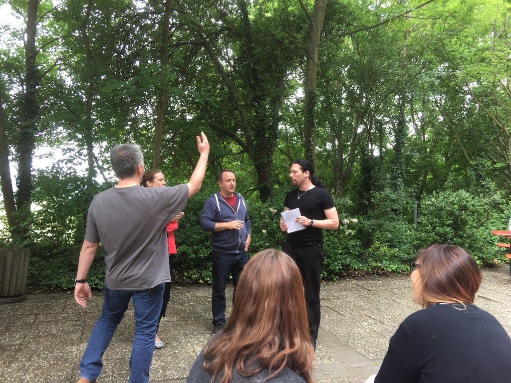 „Praktische Dramaturgie und Szenenentwicklung durch Improvisationen“ – so lautete der etwas sperrige Titel des Seminars. Für alle, die sich davon nicht abschrecken ließen und sich einfach in die Hände des wunderbaren Markus Herlyn begaben, folgte ein tolles Wochenende. Von unseren Dellerleckern wagten sich Dorothea, Marcel, Claus und Adriana an das abstrakt klingende Thema.