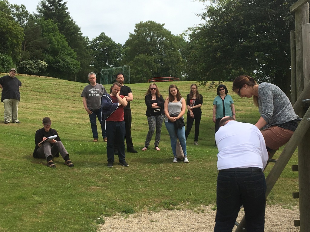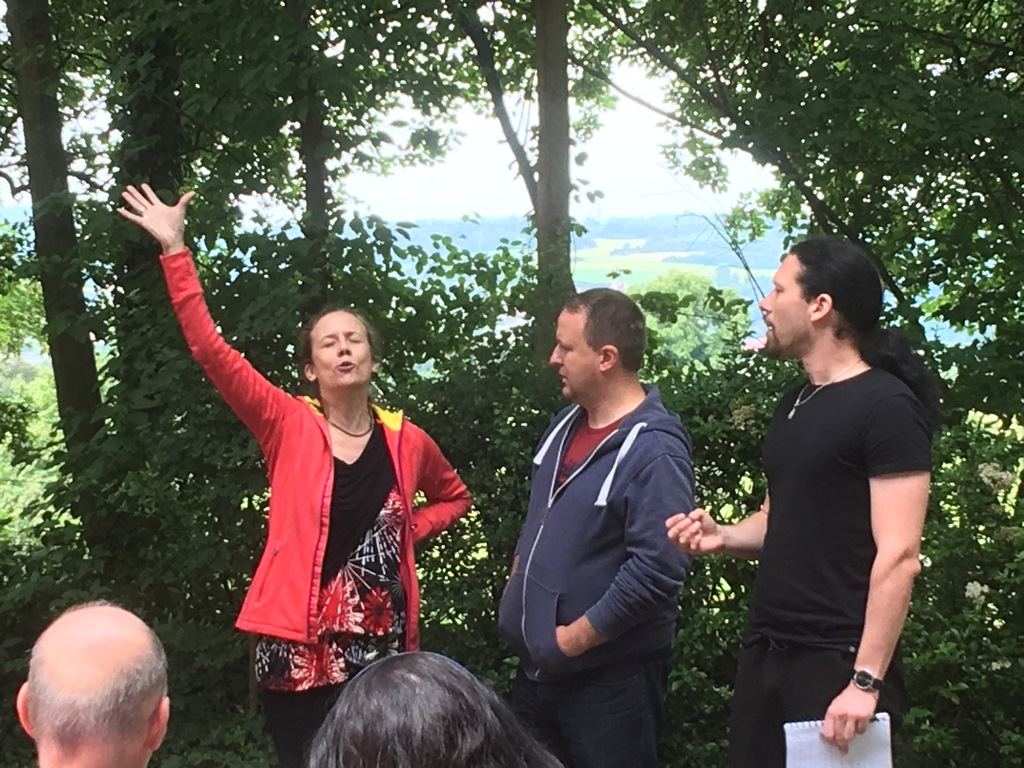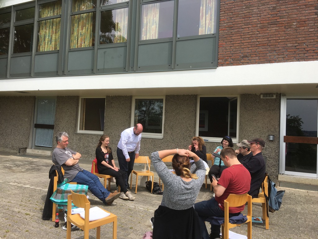 Die Jugendherberge im beschaulichen Lauterbach hatten einige begeisterte Brettspieler für ein Wochenende gewählt, um sich gemeinsam ihrer Leidenschaft zu widmen. Doch ihre erstaunten Blicke beim Anblick zwölf Erwachsener, die sich im Sonnenschein auf der Terrasse um die eigene Achse drehten und danach versuchten, ihr Gleichgewicht wiederzufinden, bewiesen, dass ein Warm-Up fürs Theater spannender sein kann, als „Catan“ zu besiedeln.